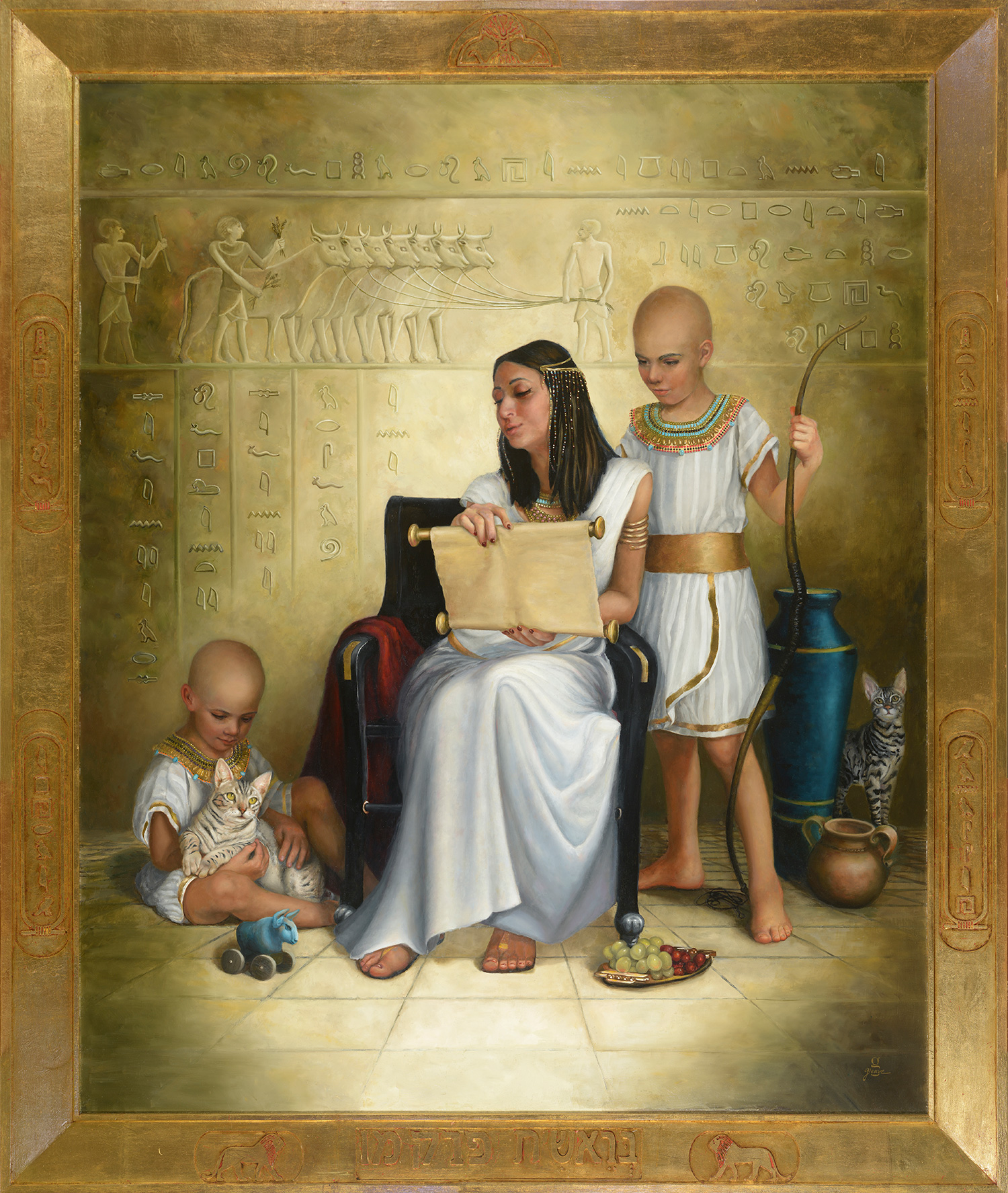 Everything in this painting has been carefully authenticated for this time period in history, from the linen hand-made clothing the models wore, to the Abyssinian cats, and the colors in the room. Everything is also symbolic. The 75 hieroglyphs and picture carvings behind the figures tell the story of Pharaoh’s
