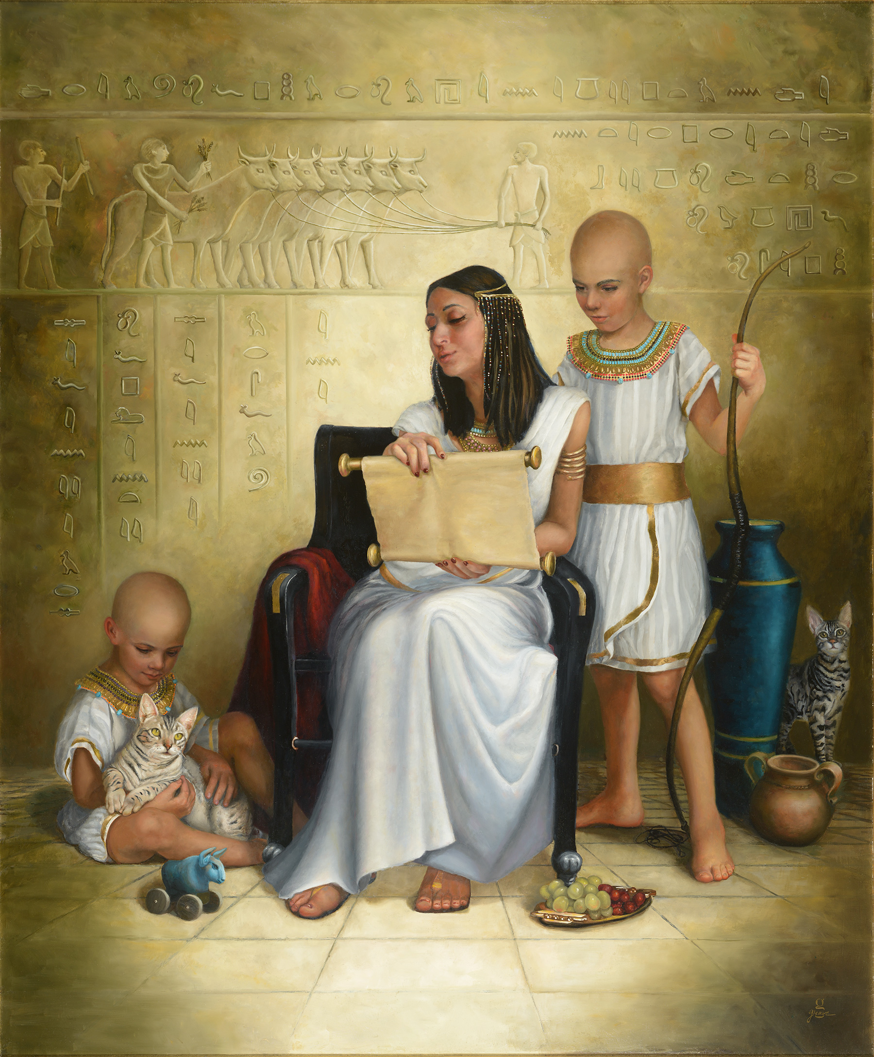 Everything in this painting has been carefully authenticated for this time period in history, from the linen hand-made clothing the models wore, to the Abyssinian cats, and the colors in the room. Everything is also symbolic. The 75 hieroglyphs and picture carvings behind the figures tell the story of Pharaoh’s