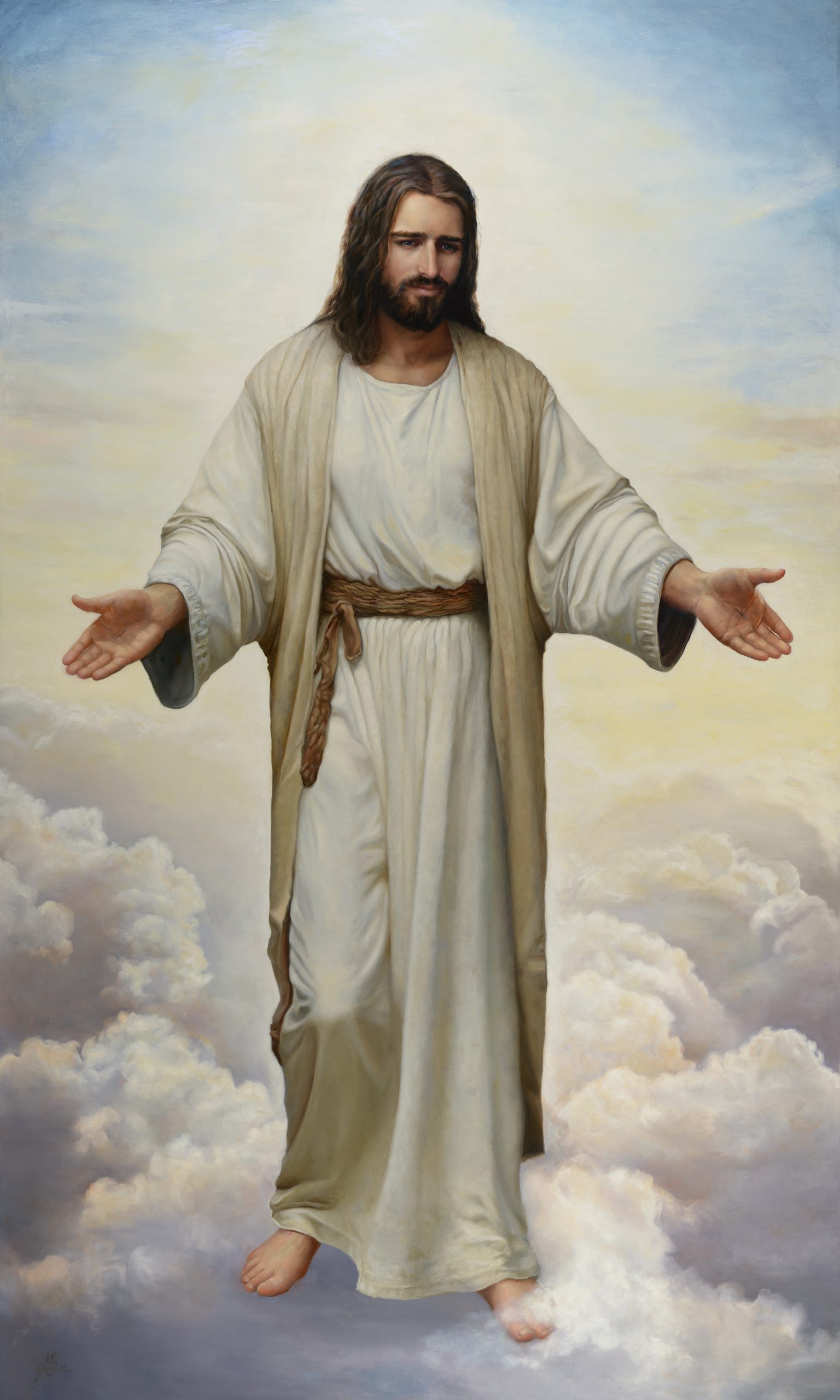 I admit, to paint the Christ in a manner that exhibited both physical and character strength sufficient to endure the demands of Gethsemane and Calvary, was undaunting.  I knew that no single model would fit that role, so I ‘borrowed’ the best characteristics from several. However, when it came to the face, I ended up replacing it 4 times.  I needed it to be strong, yet merciful and forgiving.  I needed it to be understanding of the mortal condition as well as compassionate.  I knew the eyes would say a lot.  After much prayer and drawing upon my years of scriptural study, this fourth face materialized under my brush.  I could see this face raise Lazarus from the dead, interface with a foreign power while maintaining his dignity and clarity of mind.  I could see this face heal the blind, bless little children, and calm the sea.  And I could also see him endure the Garden suffering, the injustices of a mock trial, the tortures and the culminating crucifixion.  And I cried a lot while I painted for many reasons.  Obviously, I thought of Him constantly ….and …  I was recovering from a ski accident and the pain was often overwhelming.   This was the only painting I worked on for the entire year I was healing……it felt like my offering…, my sacrifice.    I cannot begin to express how my love of Jesus Christ has grown through this experience, along with a greater desire to be like Him, and to let my hands be His.